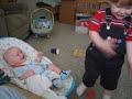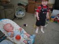 Description: Jubal playing ball, and Cole giggling at him, in our living room in OK - July 28, 2006 |